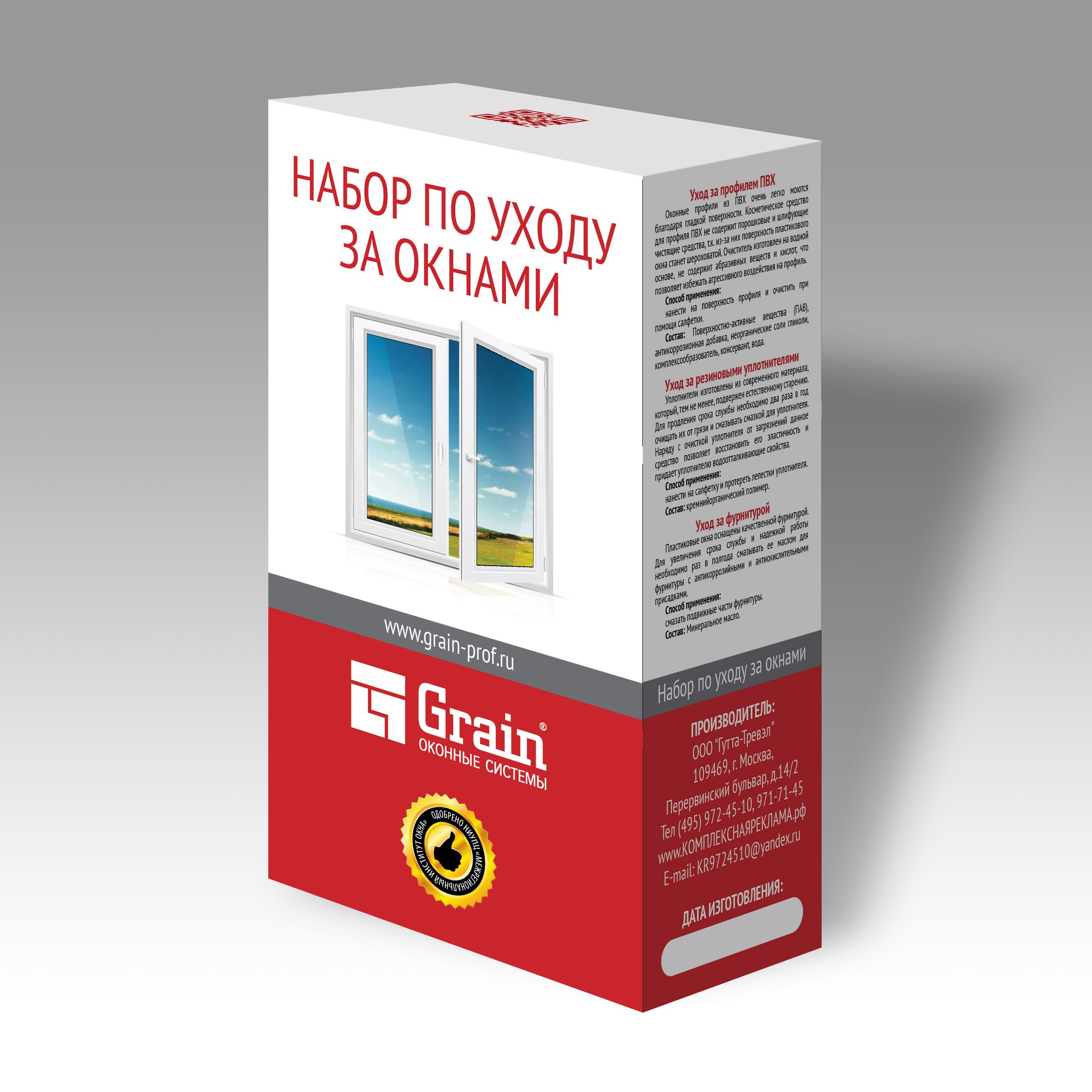 Для удобства ухода за окнами есть специальный «Набор Grain по уходу за окнами» в блистерной или бумажной упаковке. В набор входят:
