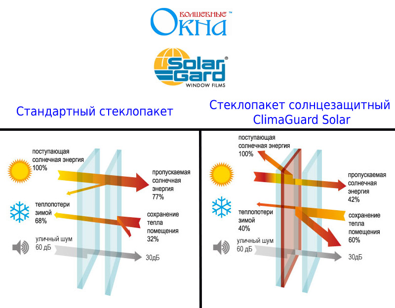 Использование солнцезащитного стеклопакета Clima Guard Solar в оконных конструкциях препятствует нагреванию помещения в летнее время. Солнцезащитные стеклопакеты не затемняют помещение, как, к примеру, жалюзи или защитная пленка. И в 2 раза уменьшают ежемесячную оплату счетов за электроэнергию, в отличие от кондиционирования. Кроме этого, солнцезащитные стеклопакеты (как и энергосберегающие) обеспечивают удержание тепла от нагревательных приборов в помещении в зимнее время. Поэтому покупатели окон существенно экономят на отоплении помещения зимой и охлаждении летом.