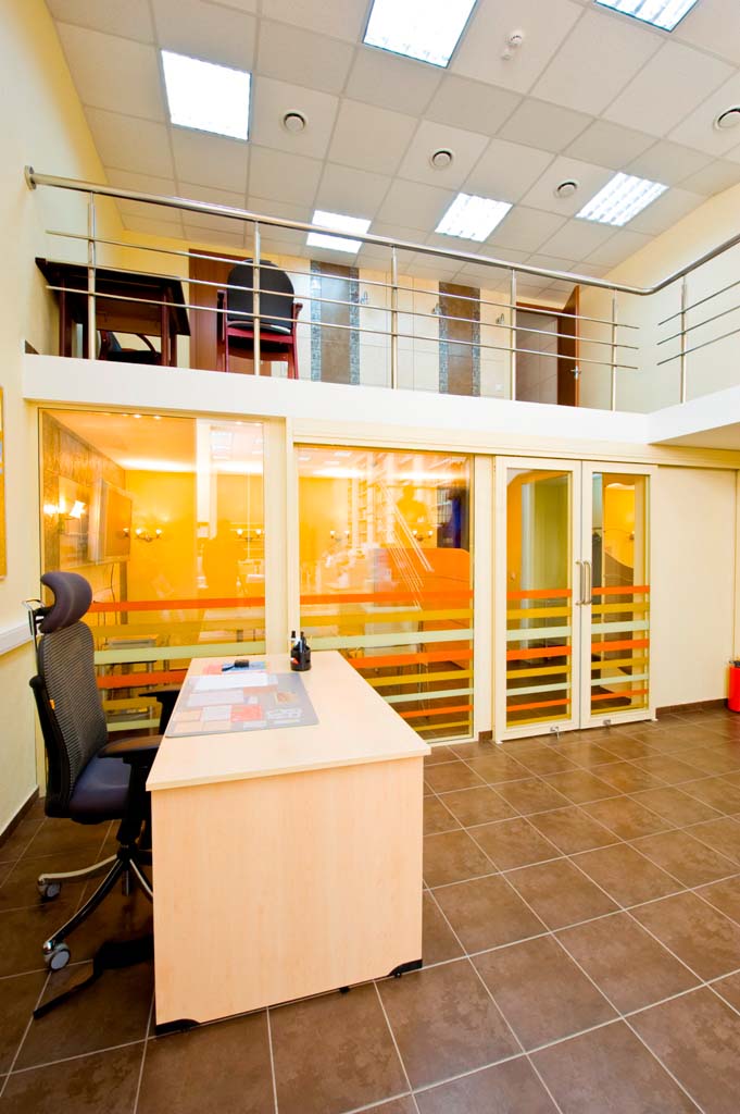 Единая дизайн-концепция яркого и светлого помещения отражается в оригинальном рисунке на прозрачной части перегородок, выполненном с помощью декоративной пленки желтых и оранжевых оттенков (цвет № ORACAL 081М, 082М, 083М).